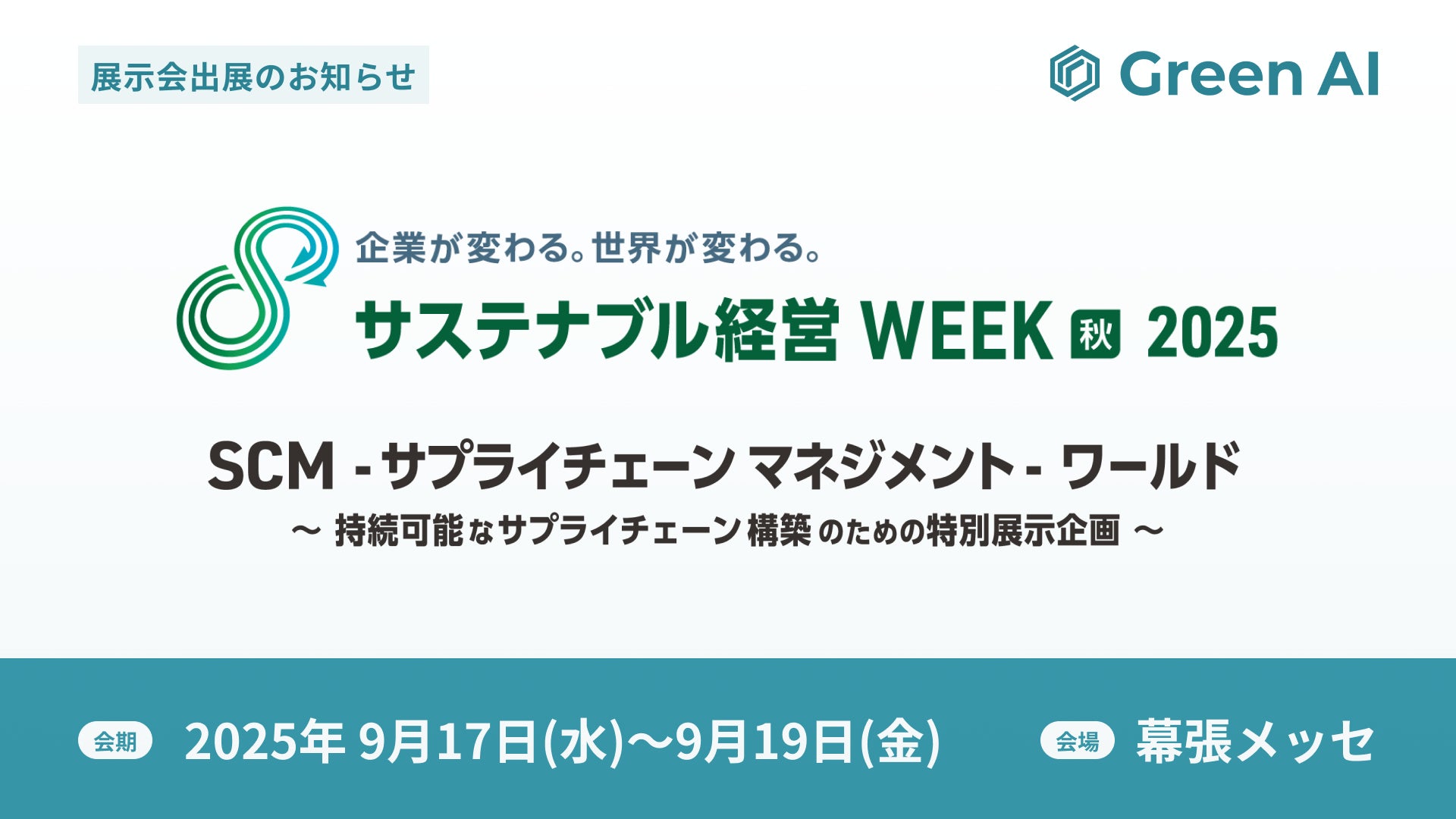 株式会社Green AI(本社:東京都千代田区、代表取締役:鈴木 慎太郎、以下「Green AI」)は、2025年9月17日(水)~19日(金)に幕張メッセで開催される「第7回 サステナブル経営WEEK【秋】2025」内「SCM・サプライチェーン マネジメント・ワールド」に出展いたします。