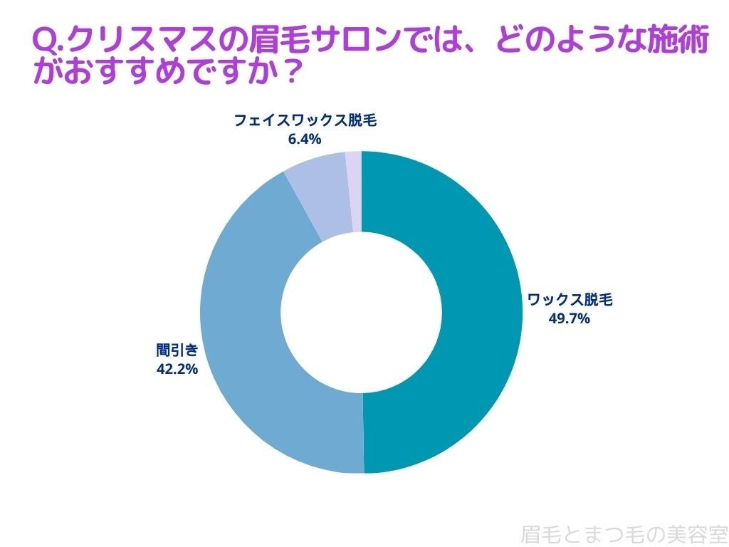 クリスマスに眉毛サロンでおすすめの施術をお聞きしたところ「ワックス脱毛(49.7%)」、「間引き(42.2%)」、「フェイスワックス脱毛(6.4%)」という結果になりました。