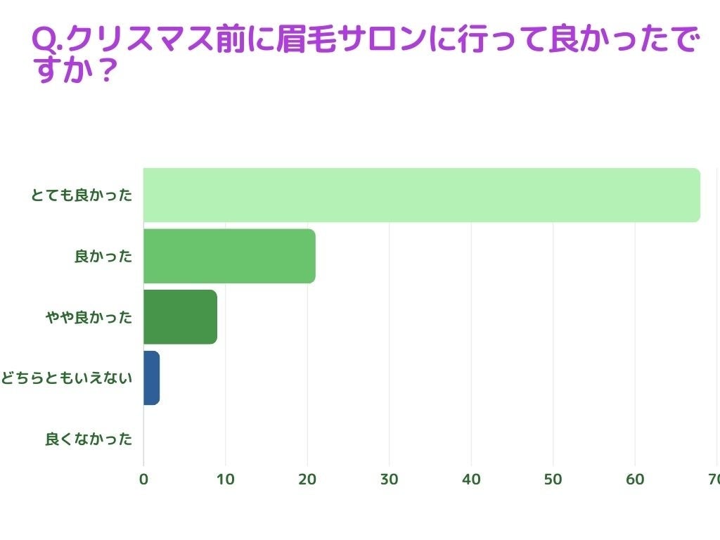 クリスマス前に眉毛サロンに眉毛サロンに行って良かったと答えた人は「とても良かった(68%)」、「良かった(21%)」、「やや良かった(9%)」、「どちらともいえない(4%)」、「良くなかった(0%」という結果になりました。