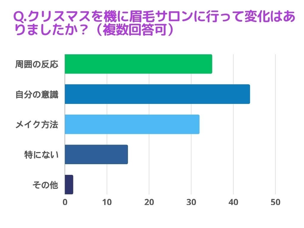 クリスマスを機に眉毛サロンに行って変わったことでは、自分の意識が変化したと答える人が多かったです。また、眉を変えたことで周囲の反応があったという人も多くいます。女性ではメイク方法をレクチャーしてくれたおかげで眉メイクの方法が変わったと答える人が多くいました。