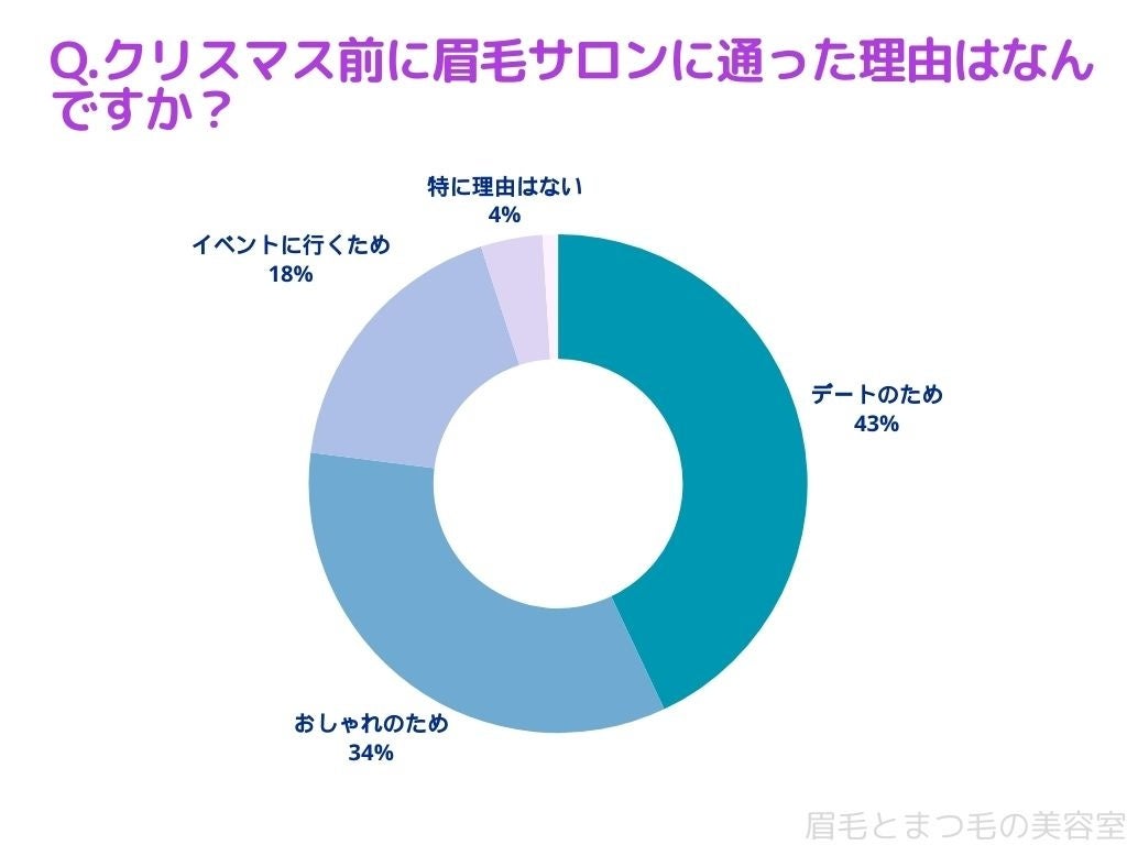 クリスマス前に眉毛サロンに行った人に理由をお尋ねしたところ「デートのため(43%)」、「おしゃれのため(34%)」、「イベントに行くため(18%)」、「特に理由はない(4%)」という結果になりました。