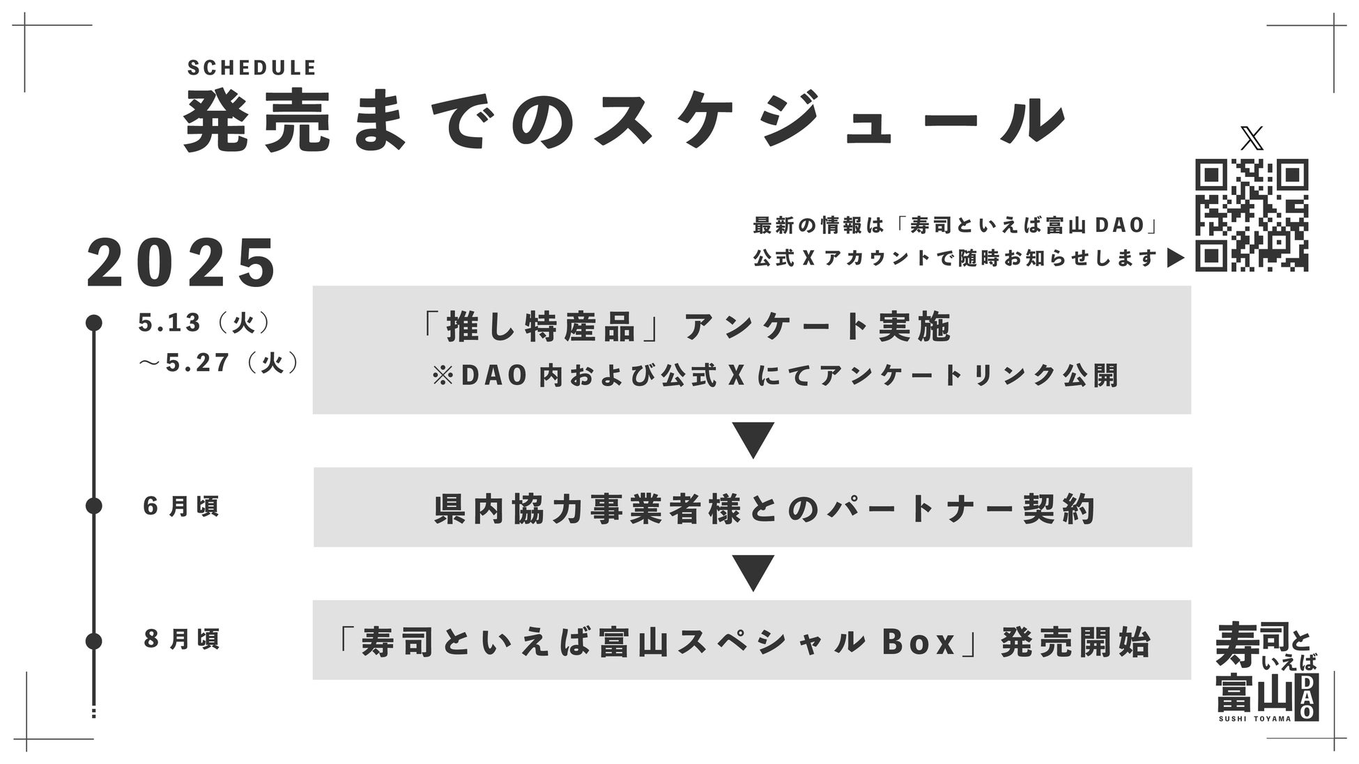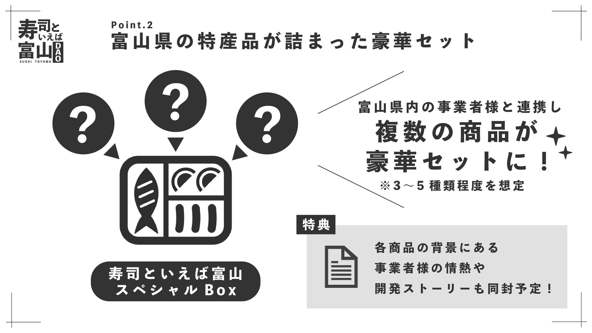 本企画では、DAOメンバーやSNSフォロワーからのご意見を参考に、寿司といえば富山スペシャルBoxに含める商品を検討します。寿司といえば富山スペシャルBoxの共創にご協力いただける富山県内の事業者様と連携し、共に富山県の価値を高めていきたいと考えております。