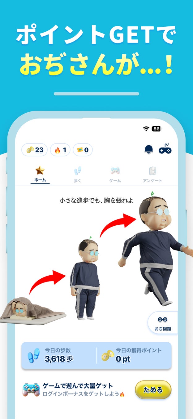 ポイント獲得を重ねることで、アプリ内の“おぢさん”キャラクターが成長していくこと