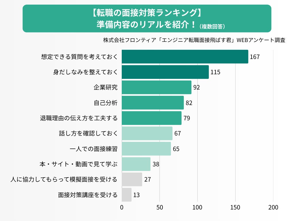 アンケートに回答した面接対策経験者(200名)に対し、実施した準備内容を複数選択で回答してもらった結果をもとに、面接対策の実態をランキング形式でまとめました。