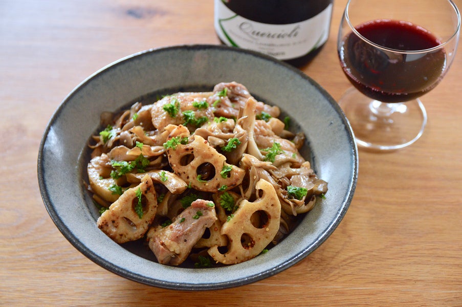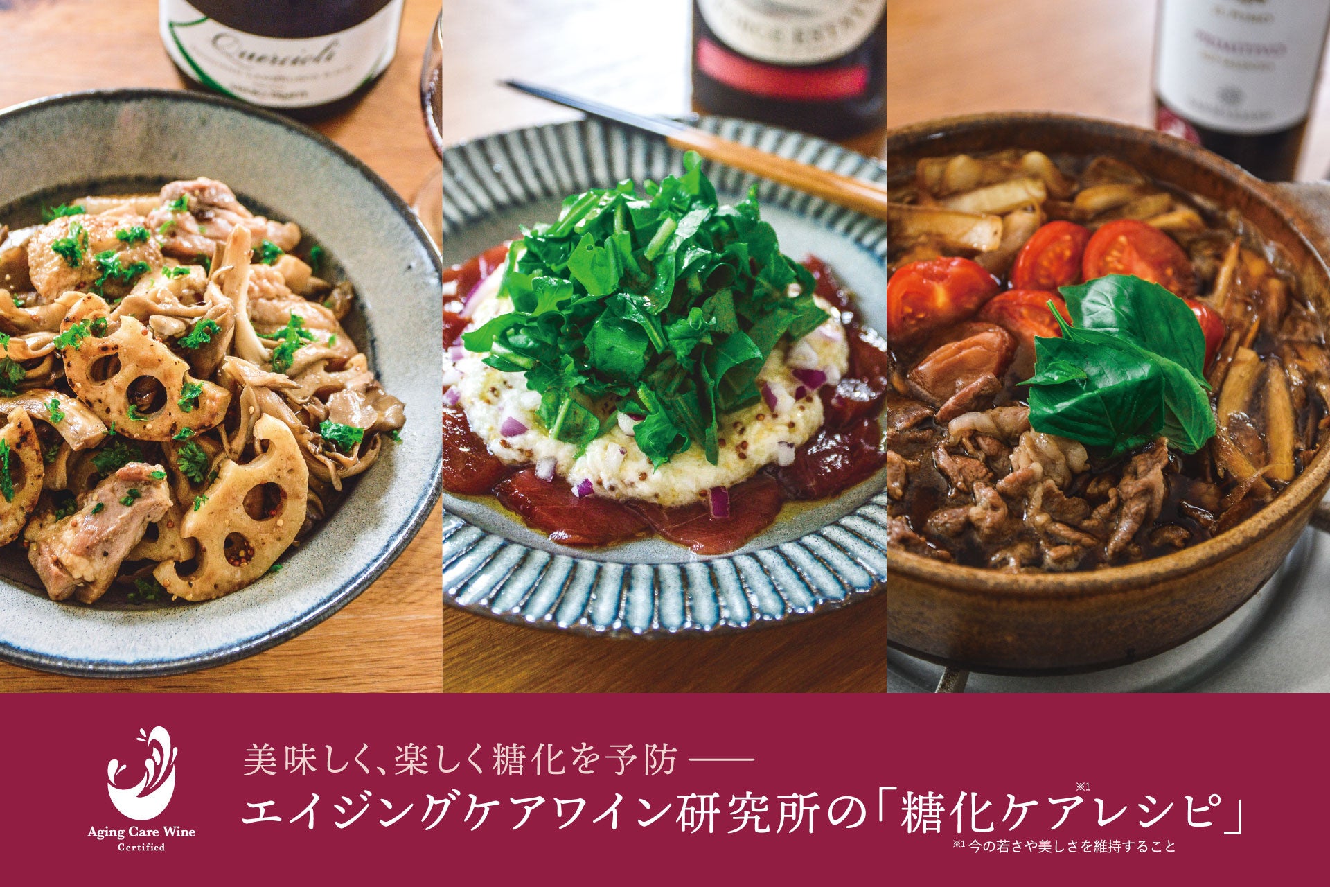 このレシピと、「エイジングケアワイン」(=老化物質AGEsを作りにくくする作用が認められ、糖化の進行予防に役立つ可能性のあるワイン)の認定を受けたワインを組み合わせて食べることで、より美味しく、そして楽しく糖化ケアをすることができますが、エイジングケアワインがお手元にない時や、休肝日であっても、糖化ケア作用のある食材を摂取することで、手軽に糖化ケアを実践することができます。