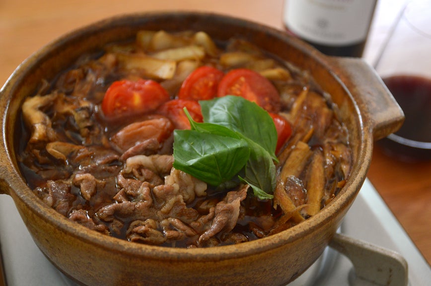 ⑧残りの牛肉とトマト、梅干しも加え、煮えたらバジルをちぎってのせる(バジルは取り分けてから散らしても)。梅干しを適当にほぐしながら取り分ける。