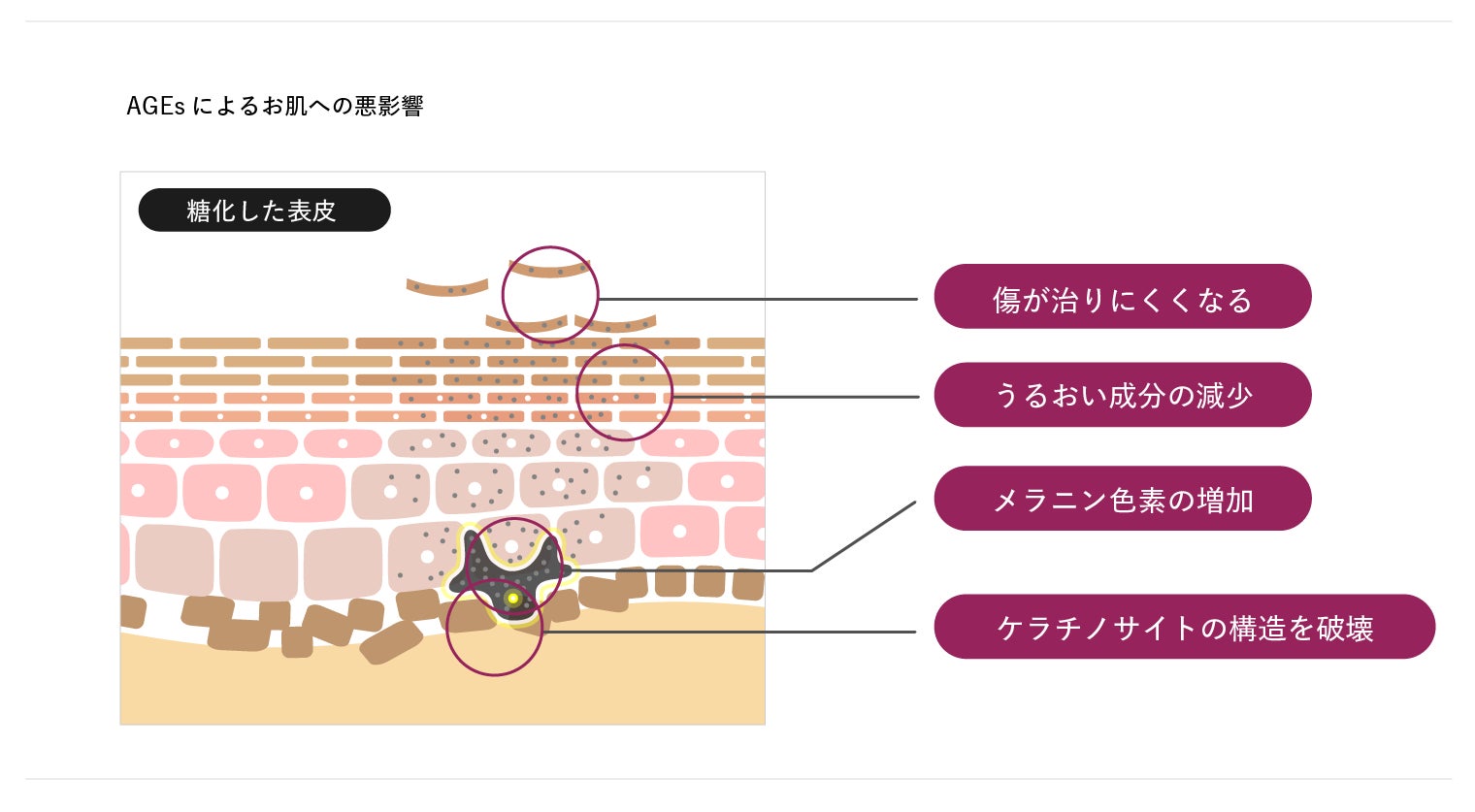細かく皮膚の内部を見てみると、表皮でのAGEsの蓄積は①キズが直りにくくなる、②肌のうるおい成分(セラミド、コレステロールなど)が減少する、③ケラチノサイトの構造が破壊されて角質層のバリア機能が低下する、④メラニン色素が増加してシミ・ソバカスの原因になる、といった悪影響を及ぼします。(※4)