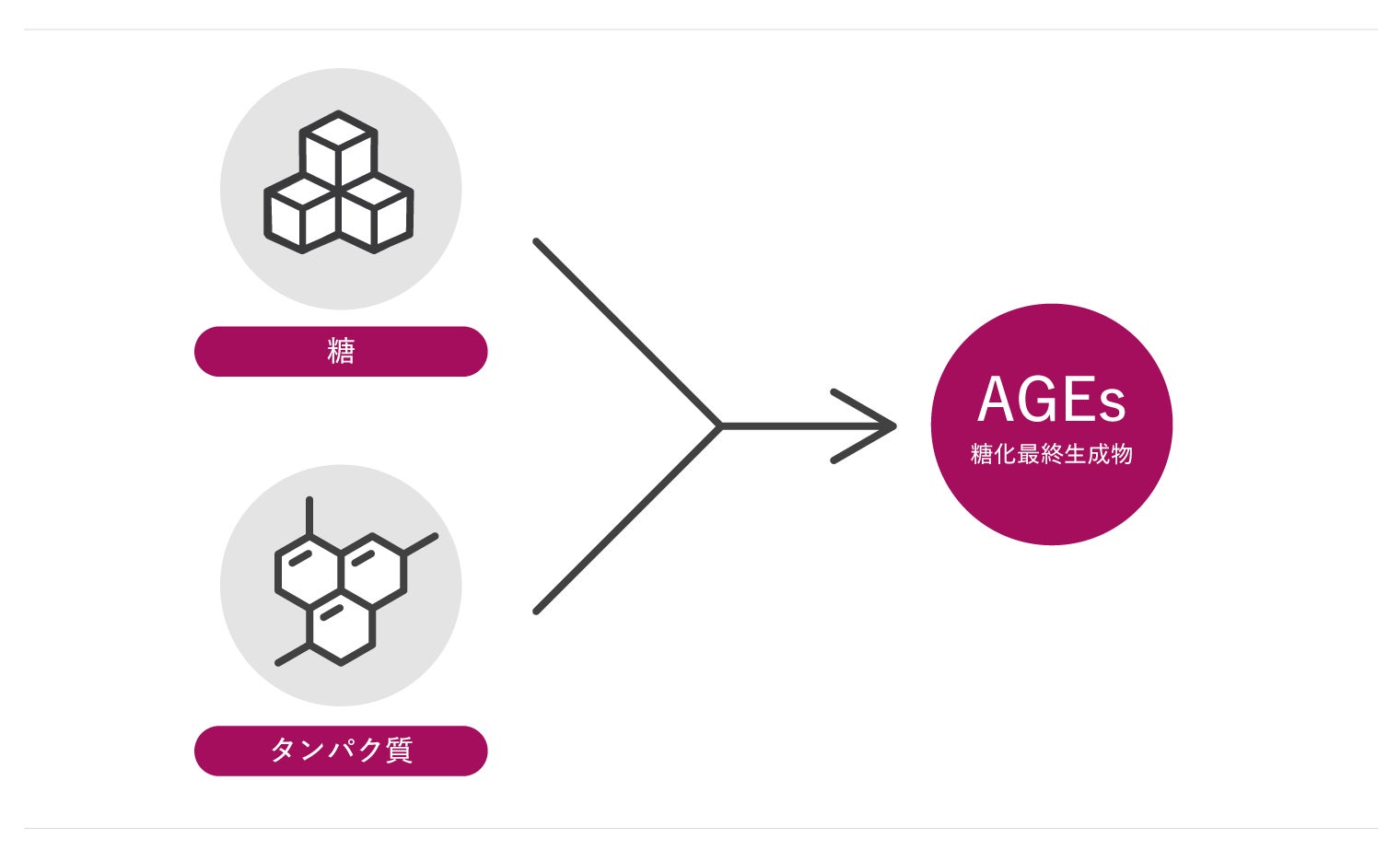 体の糖化とは、体が「コゲる」こと。食事などで過剰に摂取した糖分が体内のタンパク質と結びついて変性し、糖化最終生成物(advanced glycation end products;AGEs)を作り出すことを指します。この糖化=AGEsの蓄積は、「老化」に関わる体の様々な変化と密接に関わっています。