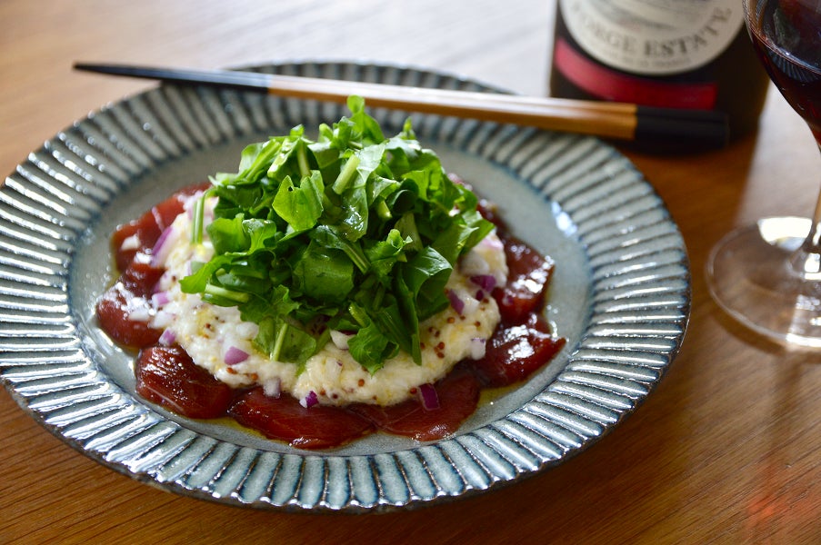 ④①のマグロをお皿に盛り、③のソースをかける。②の紫玉ねぎとルッコラを散らす。