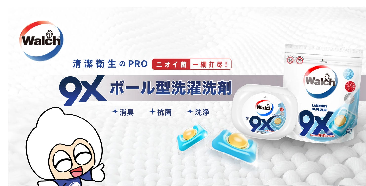 王子製薬株式会社はウォルシュの抗菌技術に着目し、ボール型洗濯洗剤を開発・製造。ボール型洗濯洗剤特有の強力な洗浄力*2に加え、9倍の消臭力*3と18時間の抗菌*1効果が見込める洗濯洗剤を完成させました。