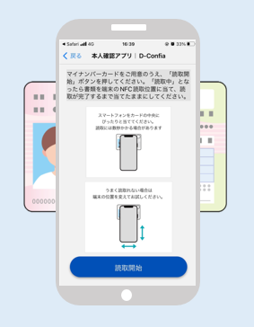 マイナンバーカードにNFC(近距離無線通信)を搭載したスマートフォンをかざすと、カードのICチップに搭載された電子証明書を利用してオンライン上で本人確認を行うことができます。