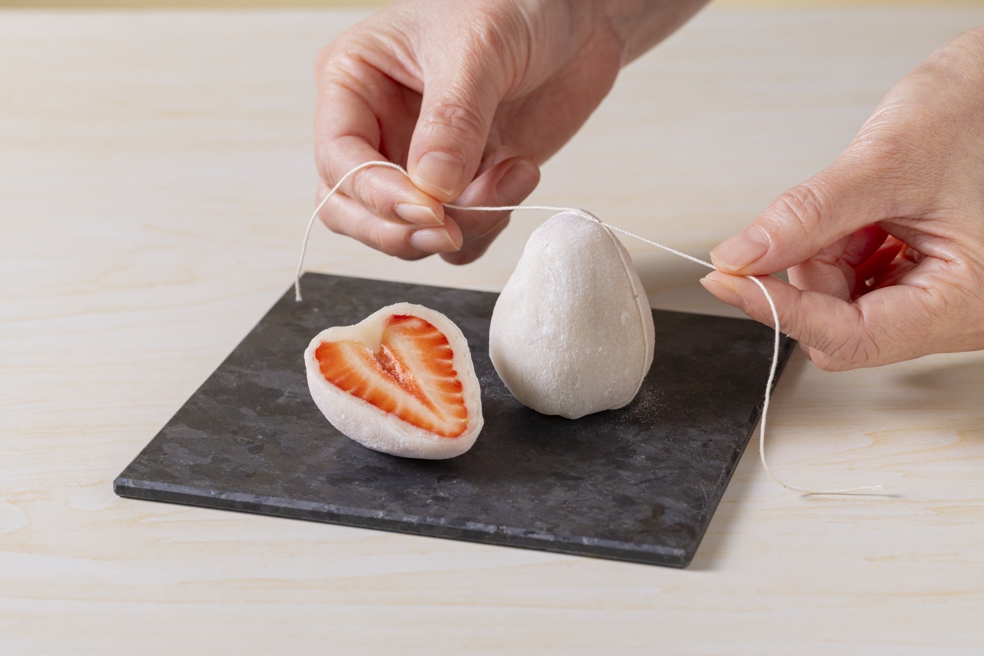 いちご大福をカットする瞬間に現れるハートは、「これからも一緒に」という気持ちを伝える象徴的な演出。