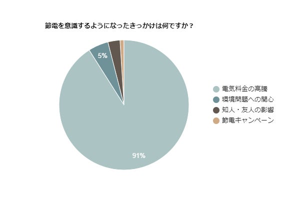 節電を意識するようになったのは、91%が「電気料金の高騰」だと回答しました。