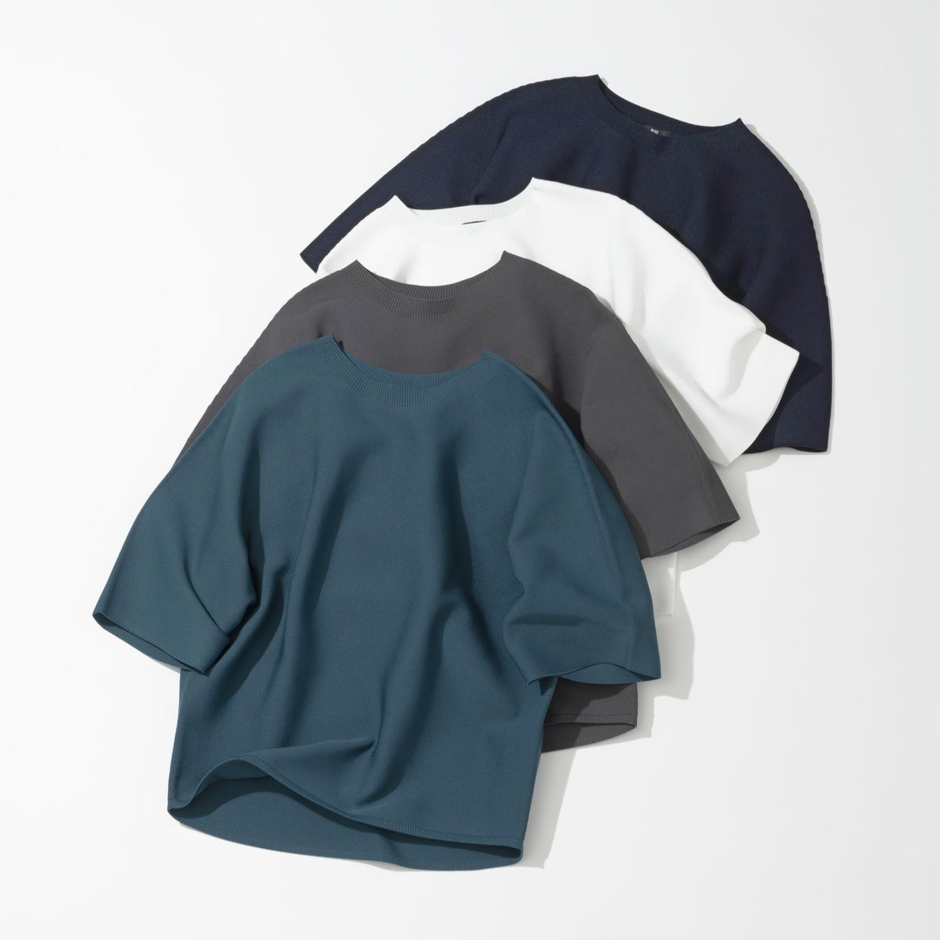 一部店舗限定で販売し、好評の声が多く寄せられた「ホールガーメント®サーキュラーセーター」の半袖が新登場。襟ぐりから放射状にボリュームを出した立体的なシルエットが気になる上半身をカバーし、すっきり見せるデザインに仕上げました。