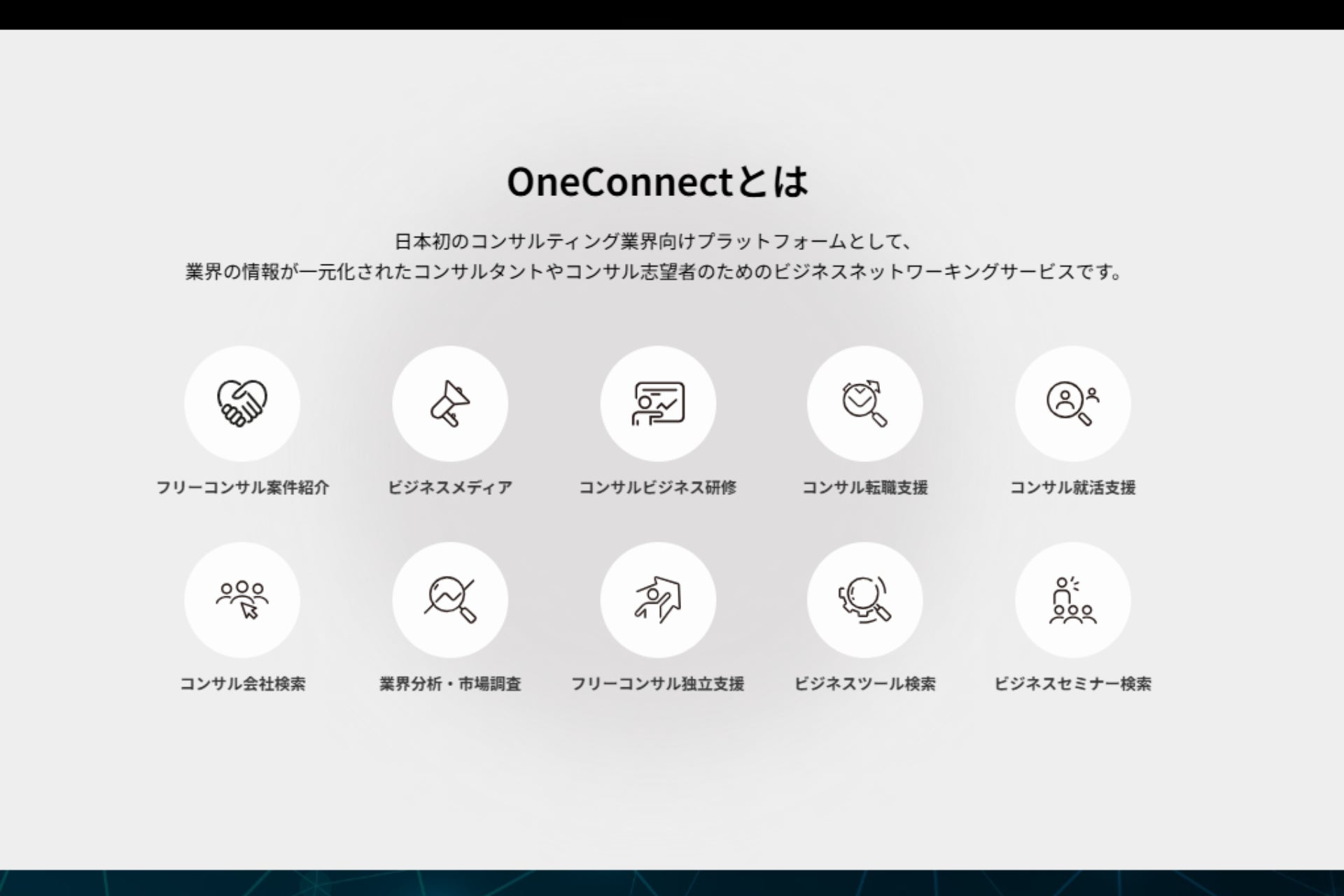 OneConnectは、日本初のコンサルティング業界特化型プラットフォームです。本プラットフォームは、現役コンサルタントやコンサル志望者のための業界情報を一元化し、幅広いサポートを提供しています。