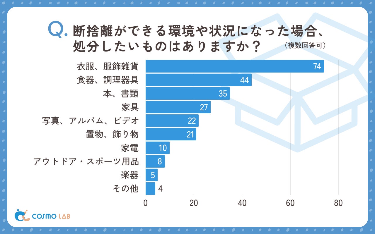 処分品目の上位は「衣服、服飾雑貨」(96.9%)、「食器、調理器具」(72.5%)、「本、書類」(70.4%)となっています。特に衣類は季節や体型の変化で不要になりやすく、また思い入れも比較的少ないため、断捨離の入り口として選ばれやすい傾向が見られます。
