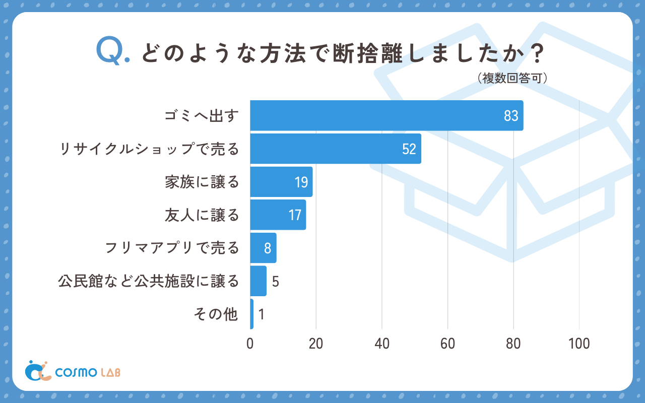 処分方法は「ゴミへ出す」(84.7%)が最多ですが、「リサイクルショップで売る」(53.1%)も半数を超えています。また、「家族に譲る」(19.4%)、「友人に譲る」(17.4%)という回答も見られ、単なる廃棄だけでなく、物の有効活用を意識した多様な処分方法が選択されています。