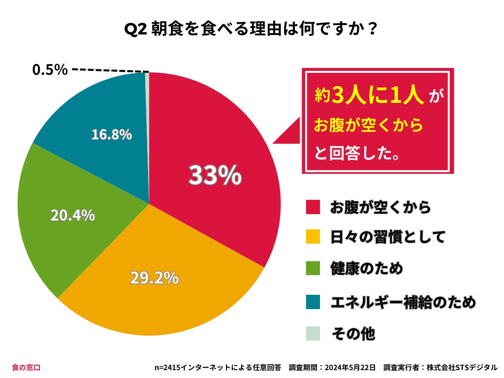 Q2 33%の人は「お腹が空くから」と回答、「日々の習慣として」と回答した人は29.2%でした。
