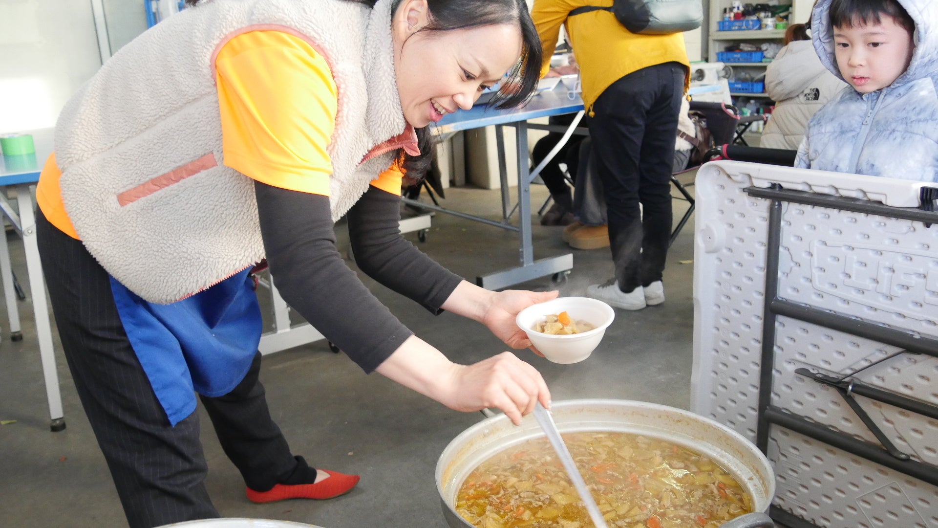 内覧会後は、ボランティアの子ども達の案内で保護者が作った「豚汁」を召し上がっていただき、老若男女ひとつのテーブルに座り、温かいぬくもりを感じていただけました。