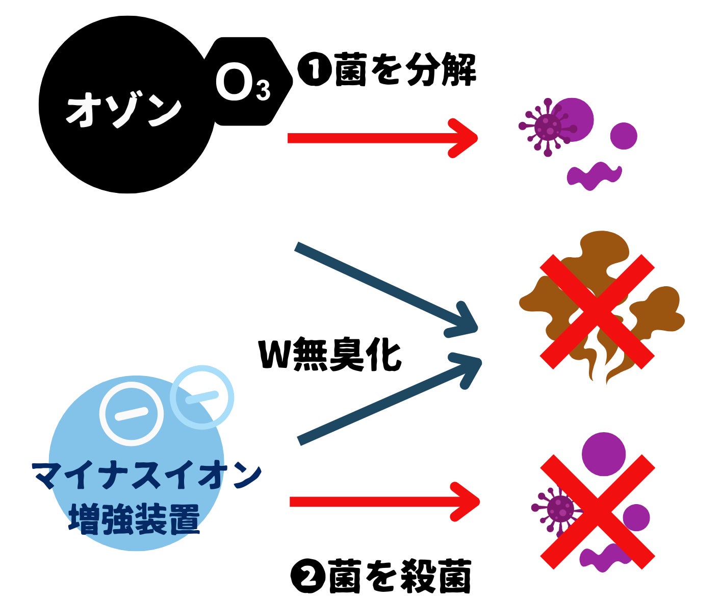 マイナスイオンと低濃度オゾンにより、臭いの原因物質を元から分解・殺菌・無臭化。