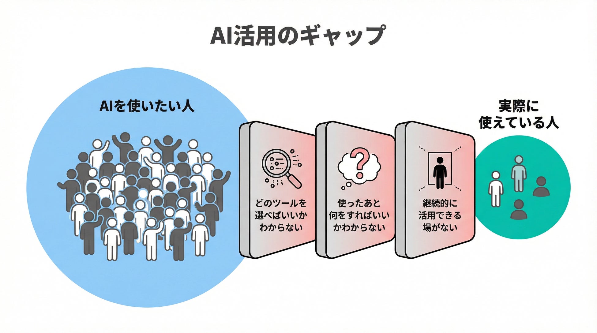 意欲はある。しかし、その意欲を"実際の行動"に変える仕組みが足りていません。これが、日本のAI活用が直面している構造的な課題です。