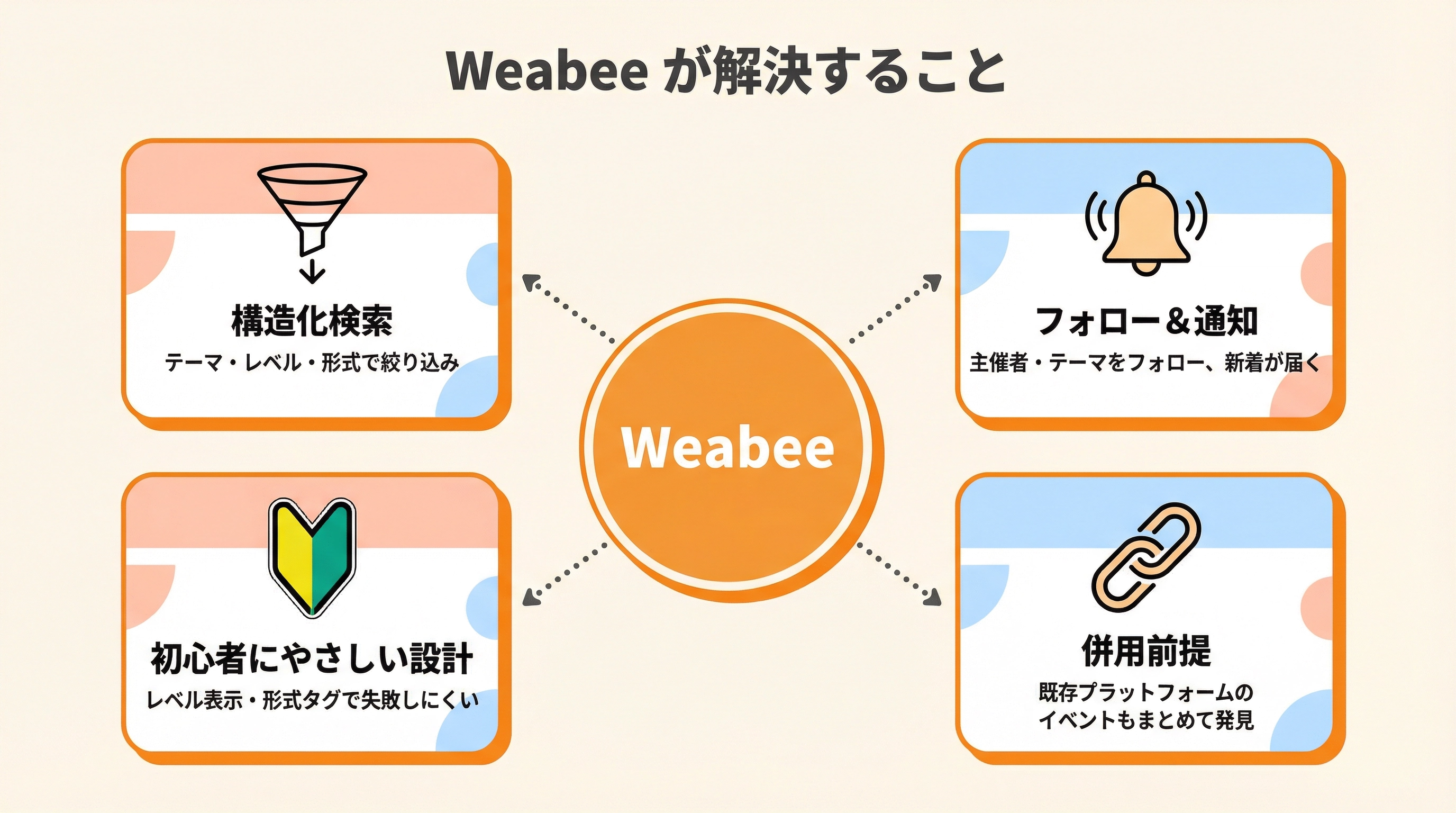 既存のイベントプラットフォームが「開催・申込・決済」のインフラであるのに対し、Weabeeが目指すのは「発見・フォロー・継続参加」のOS(※)です。AIイベントの情報を一箇所に集約し、初心者でも自分に合ったイベントを見つけられる場を目指します。