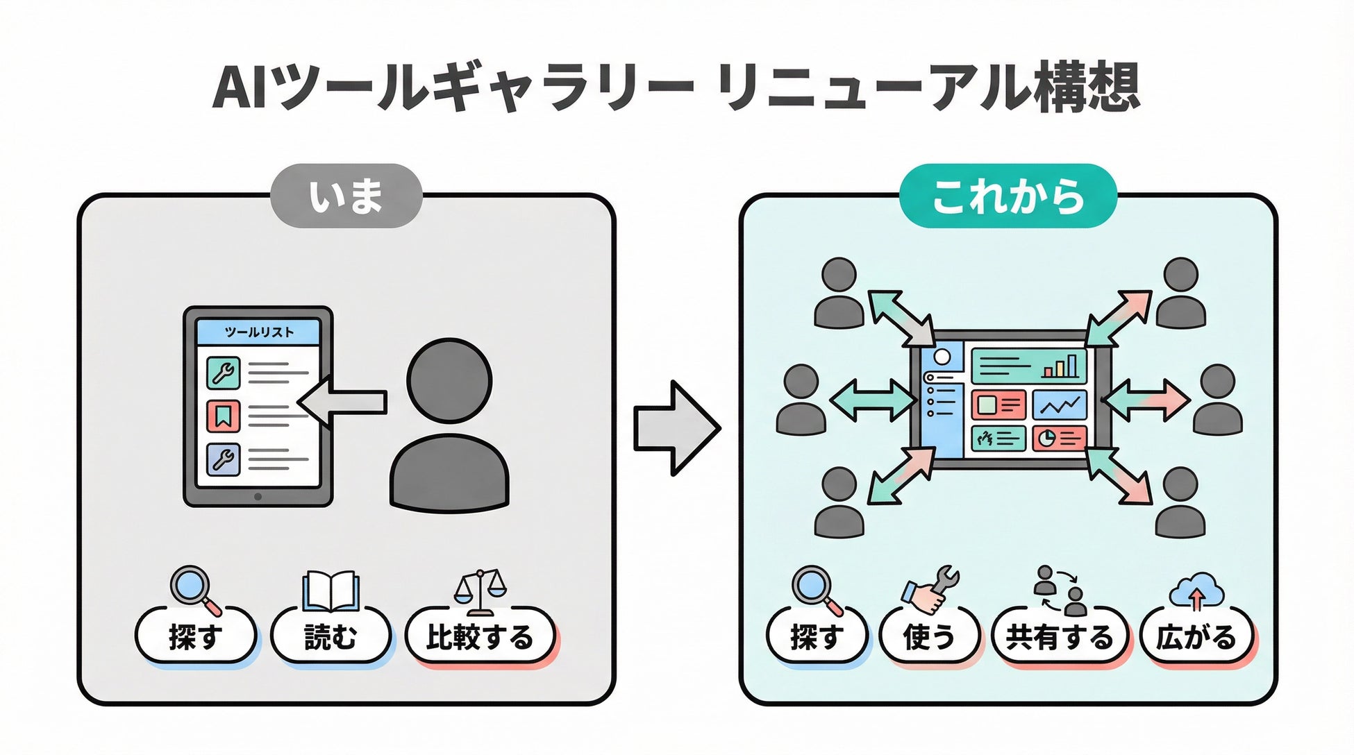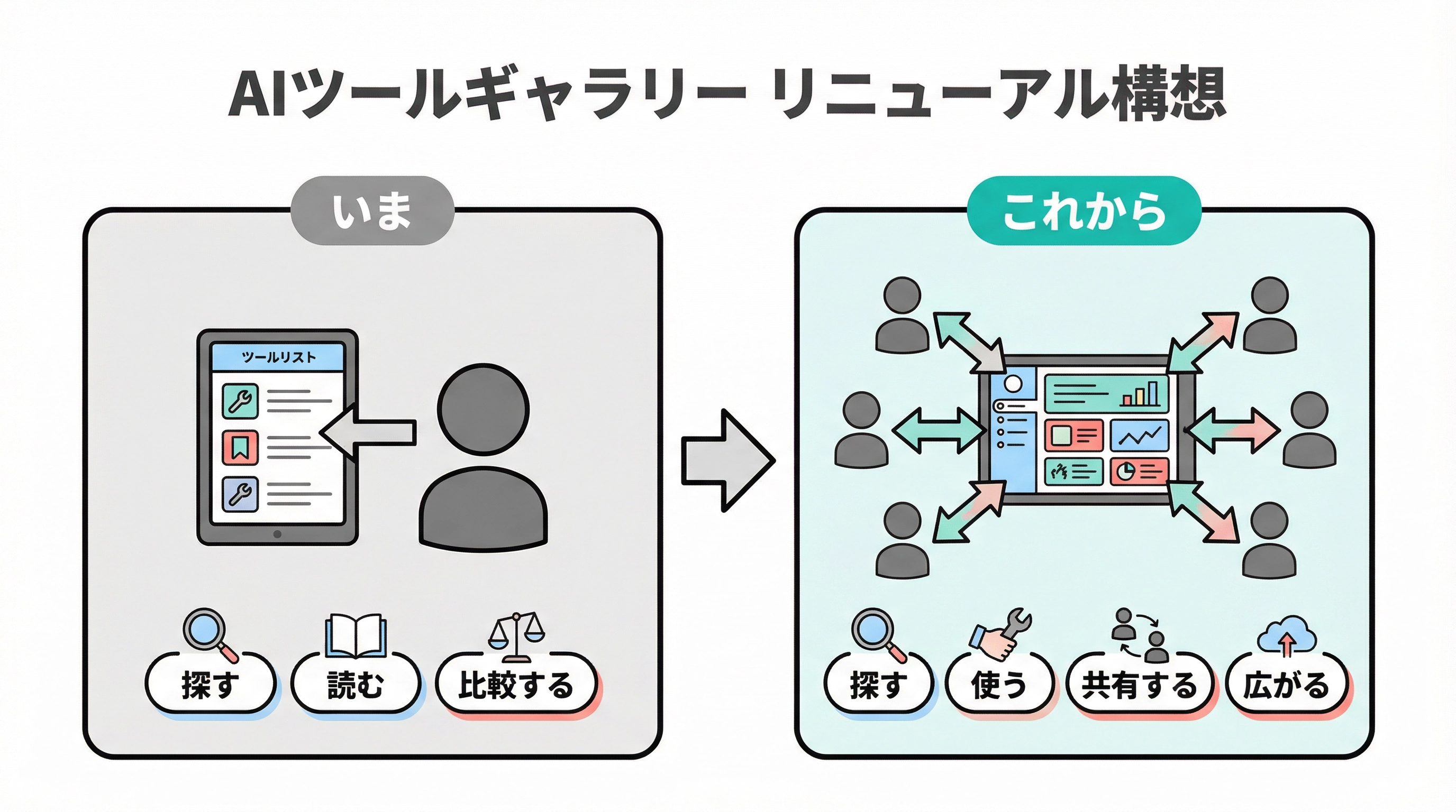 現在、AIツールギャラリーのフルリニューアルを進めています。目指すのは、「AIツールを見つける場所」から「AIツールを使い始める場所」への転換です。