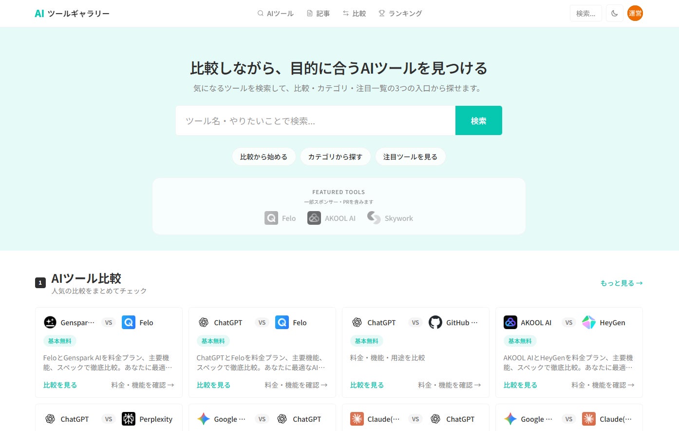 概要: AIツールの検索・比較・レビューができるメディアプラットフォーム