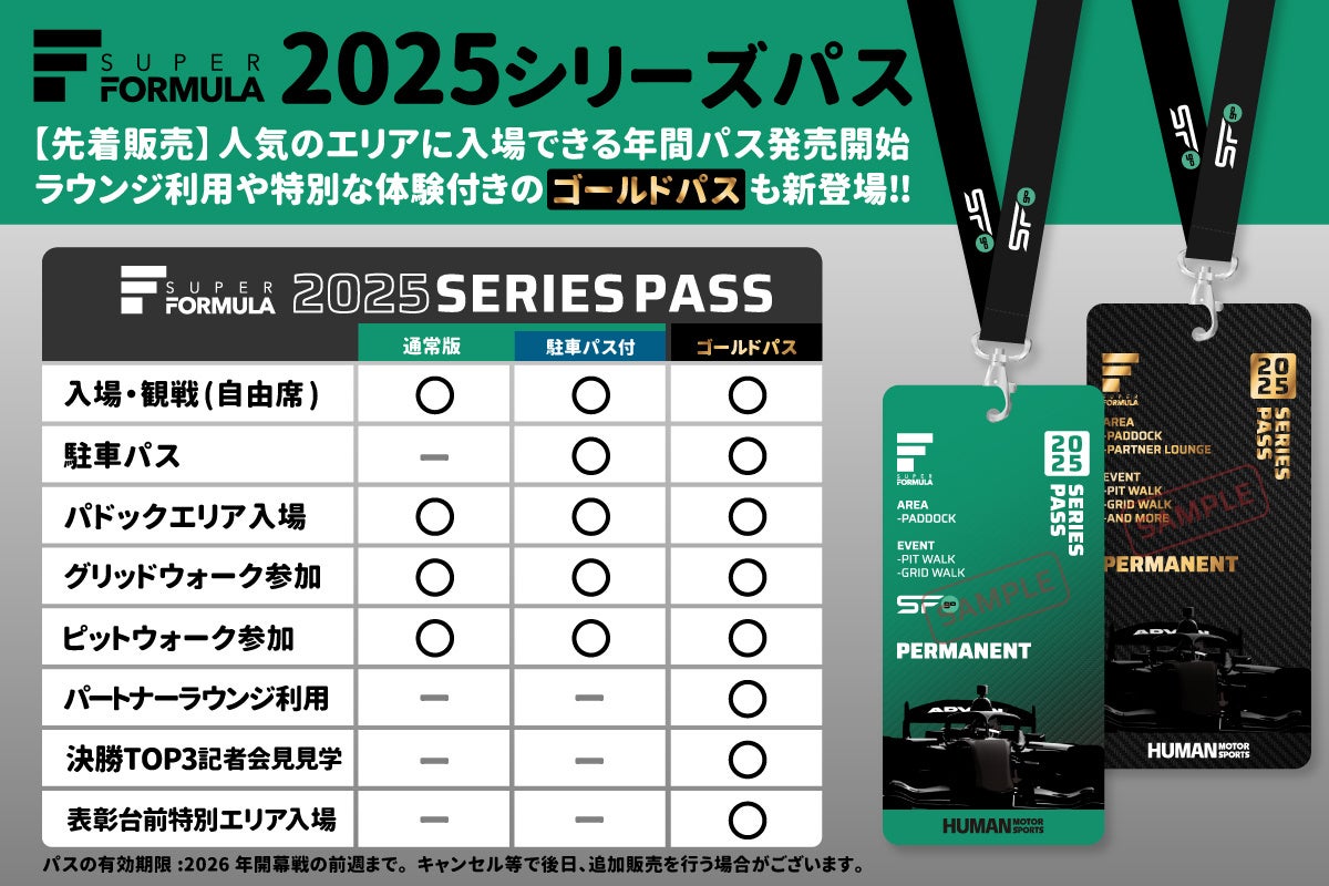 3 月 7 日(金)・ 8 日(土)・ 9 日(日)に鈴鹿サーキットで開幕を迎える 2025 シーズンの SUPER FORMULAは全 7 大会のうち 5 大会が金曜日にフリー走行、土曜日・日曜日ともに予選・決勝が行われる 2 レース制となり、お楽しみいただける機会が大幅に増加します。今回発売する「2025 シリーズパス」は、全大会でレーシングドライバーの活躍を最も近くでご覧いただける体験を全て詰め込んだ、大変魅力的な商品や、VIP エリアでの観戦やお食事が出来る「パートナーラウンジ利用」 、関係者のみが入れる「決勝 TOP3会見見学」等プレミアムな体験が出来る「ゴールドパス」もご用意しております。