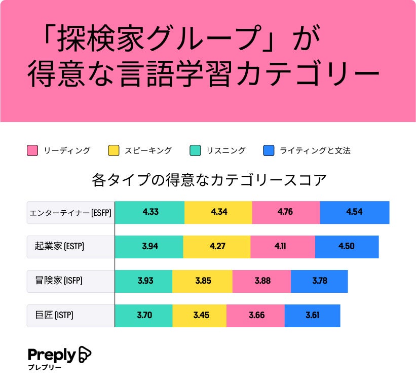 最後に紹介するのは探検家グループです。このグループに属するのは、観察型(S)で探索型(P)の人々で、 即興性、独創性、そして柔軟性を特徴とします。各カテゴリでは総じて最下位にランクインしていますが、それでも言語学習における強みがあります。