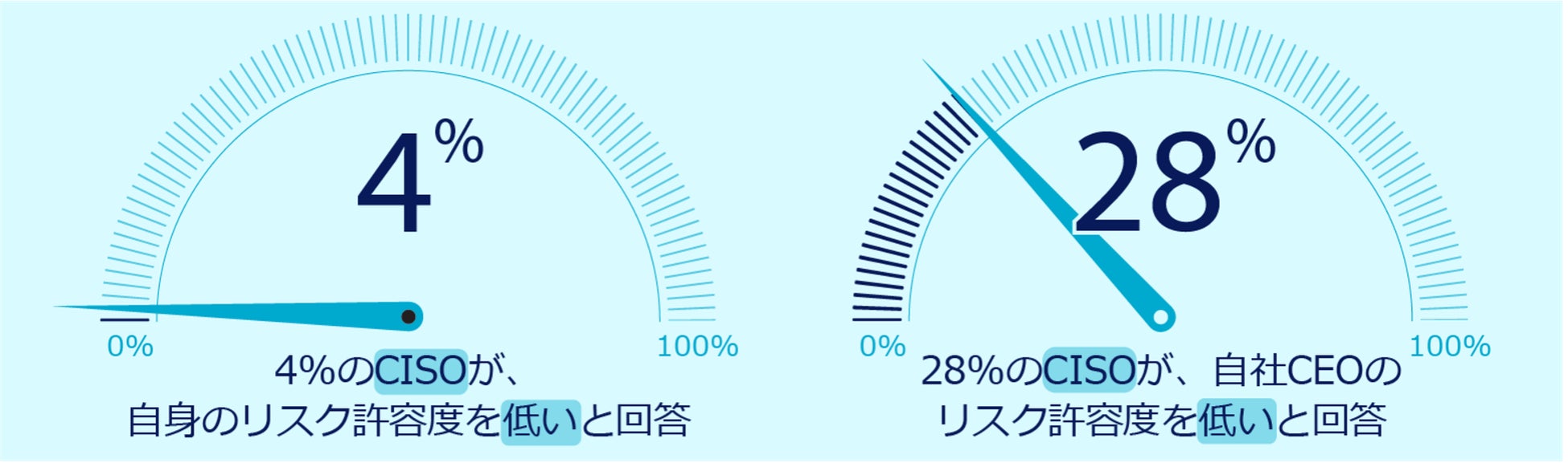 CISOが経営幹部における戦略的メンバーの一員へと進化するなか、今回の調査は、CISOの役割を探る目的のもと世界各地の1,000人を超えるCISOを対象に行われ、日本からも200人のCISOが参加しました。この結果、職務の性格上リスク回避志向だと思われていたCISOの従来のイメージとは裏腹に、日本では自身のリスク許容度を低いとするCISOはわずか4%にとどまることが明らかになりました。これに対し、世界的にはリスク回避志向はより高い傾向が見られます(世界平均16%)。また、その倍の人数(世界平均32%)が自社CEOのリスク許容度を低いと回答し、自身より自社CEOの方がリスク回避志向であると見なしています。日本ではこの数値は若干低く、28%でした。