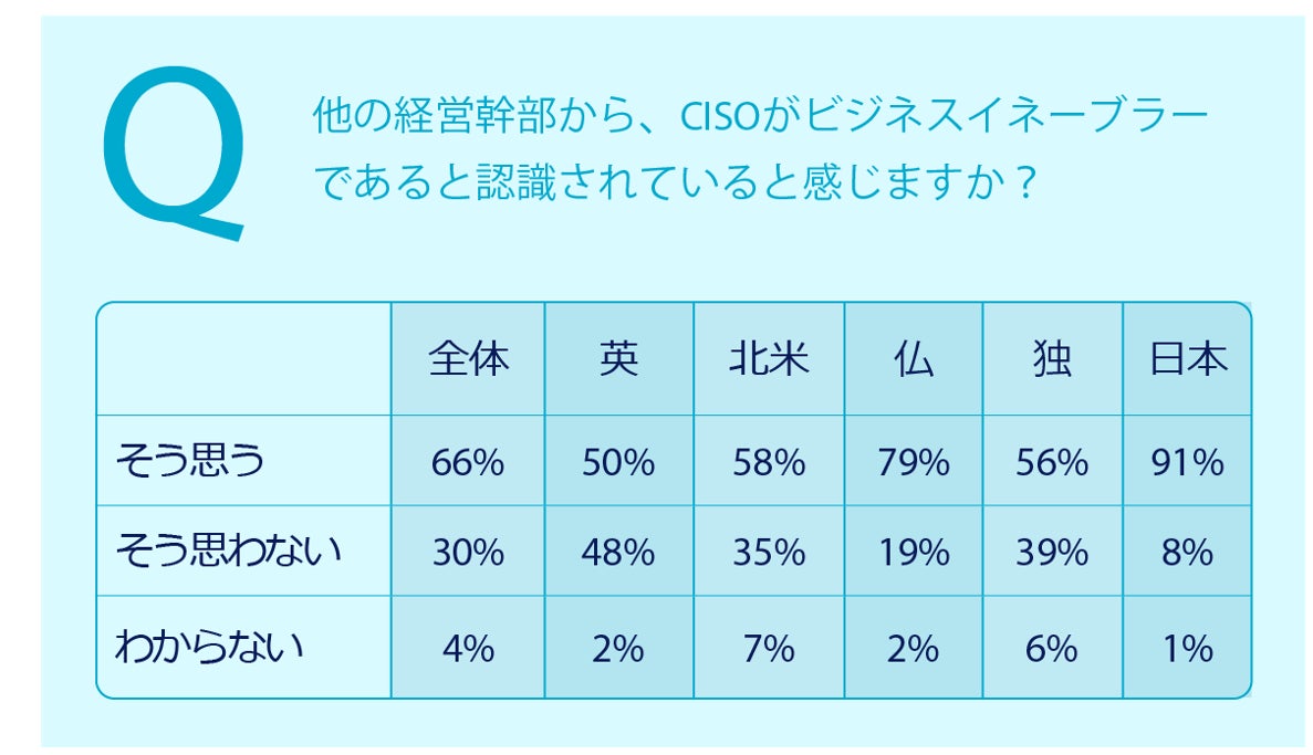 日本のCISOの88%は、「CISOがイノベーションを可能にする役割を果たせることを他の経営幹部は理解していない」と考えています。 これは世界的に最も高い数字であり、世界平均(65%)を大きく上回っています。
