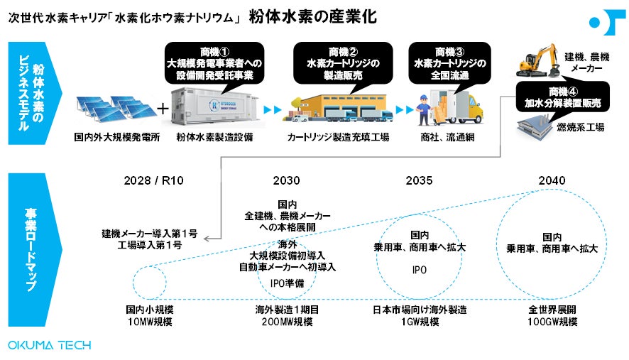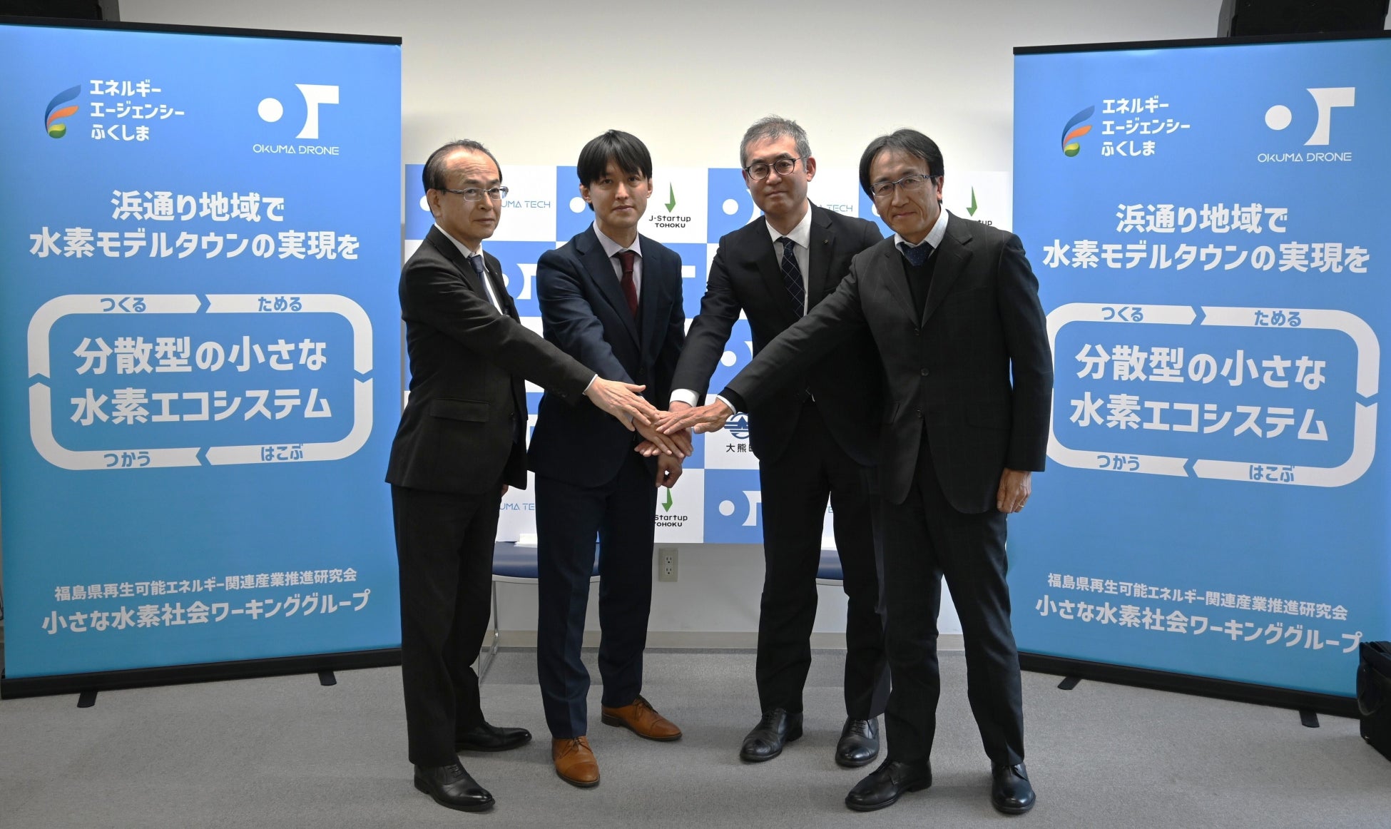 OKUMA TECHは、2021年の創業以来、重量輸送のための水素燃料電池ドローン、水素ステーション用減圧装置、国産セルスタック、小型の可搬式水素燃料発電装置、小型の水素製造装置などを次々と研究開発してきました。また、福島県およびエネルギーエージェンシーふくしまの協力により、福島県浜通り地域発の「小さな水素社会」の構築を目指す産学官連携組織の立ち上げと運営も行っています。