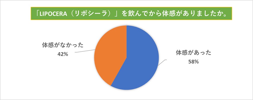 アンケート対象者に「LIPOCERA」を15日間続けて摂っていただいた後、「『LIPOCERA』を飲んでから体感がありましたか。」という質問をしたところ、58%の方が「体感があった」と回答しました。