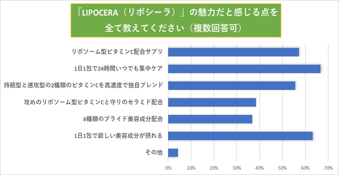 佐藤薬品工業のリポソーム型ビタミンCサプリメントである「LIPOCERA」の魅力だと感じる点を聞いたところ、「1日1包で24時間いつでも集中ケア」が1位でした。続いて、「1日1包で欲しい美容成分が摂れる」が2位にランクインしていることから、持続力のあるリポソーム型ビタミンC自体の認知度は低いものの、1日1包で良い美容サプリメントは、女性に求められている商品であるということが判明しました。