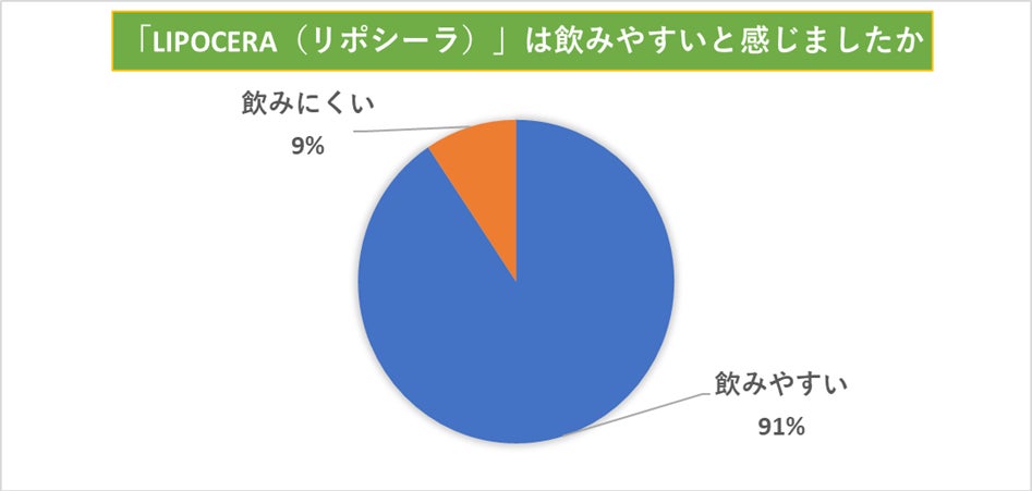 アンケート対象者に「LIPOCERA」を15日間続けて摂っていただいた後、飲みやすさを調査したところ9割以上の方から「飲みやすい」という回答が得られました。「LIPOCERA」にはリポソーム型ビタミンCを配合しており、開発当時、味の調整には苦労しましたが、調査の結果、多数の方に納得していただける飲みやすさの商品であることが分かりました。