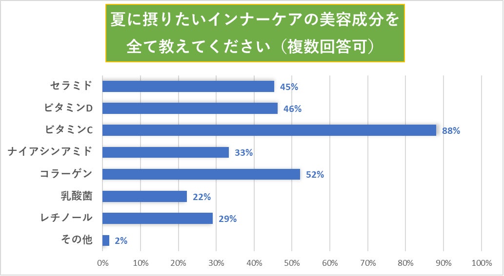 夏に摂りたいインナーケアの美容成分を調査したところ、最も回答が多かったのは「ビタミンC」でした。2位以降は、「コラーゲン」、「ビタミンD」、「セラミド」といった順に人気の成分であることが分かりました。
