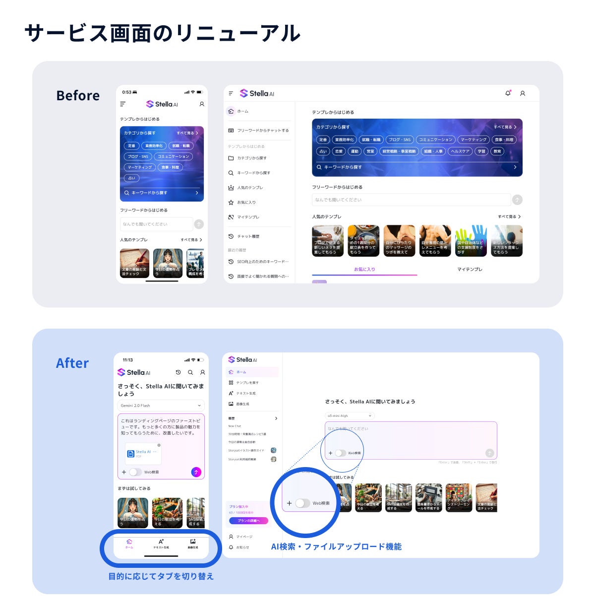「Stella AI」では、これまで単一のUIで、生成AIのテンプレートやフリーワードの生成を提供していましたが、より直感的な操作を実現するため、目的に応じたメニューのタブを新設することで、お客さまの利用用途に合わせて操作画面を選択できるようになりました。新たに追加されたホーム画面では、AIモデルの変更やファイルのアップロード、AI検索※1などの操作を一元的に選択でき、より快適に生成AIをご利用いただけます。また、「画像生成」と「テンプレ検索」のタブを用意し、使用目的に応じてUIを切り替えてご利用いただけるようになり、より分かりやすく操作いただけるように変更しました。