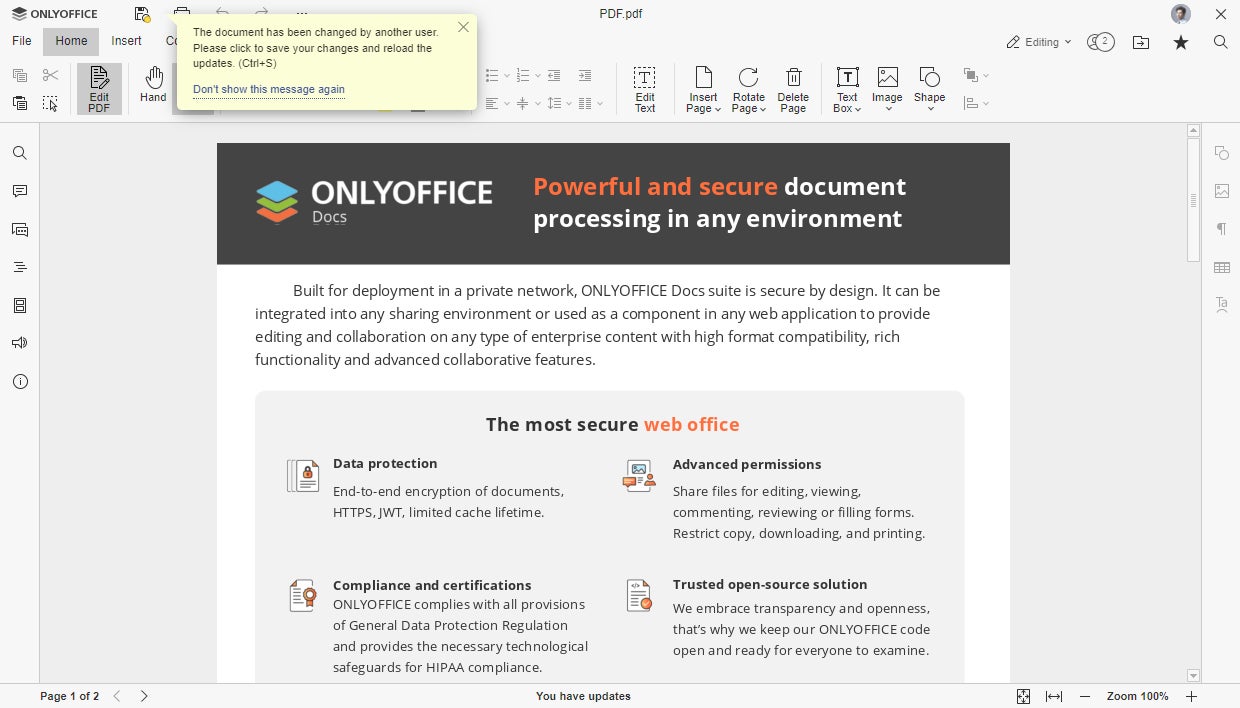 ONLYOFFICEのPDFエディターは、さらに洗練されました。このリリースから、PDFファイルの共同編集が可能となり、編集モードに切り替えるとデフォルトで「段落ロック」機能が有効化されます。これにより、変更内容は「保存」ボタンを押すことで反映されます。リアルタイムで共同編集を行いたい場合は、「高速モード」を選択するだけで設定が完了します。