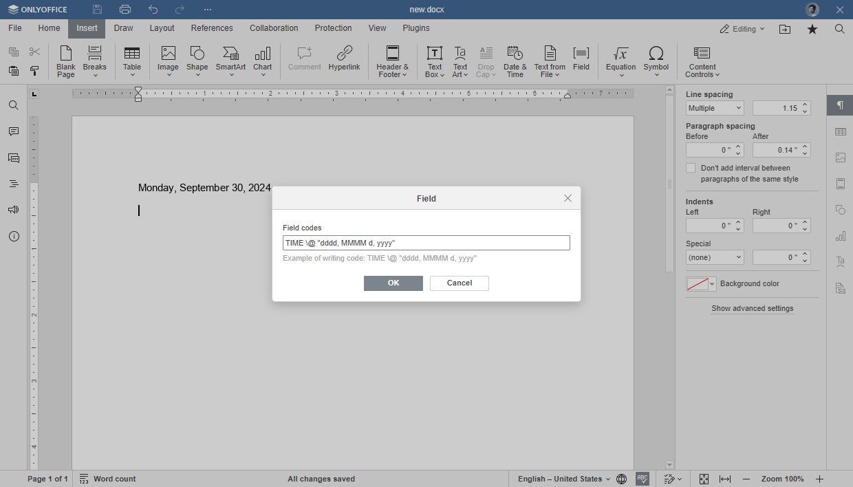 新しいバージョンでは、ドキュメント作成を効率化するための便利な機能「フィールドコード」が追加されました。これにより、ページ番号や作成者名、日付、時間など、変更可能なデータを自動的に更新できます。