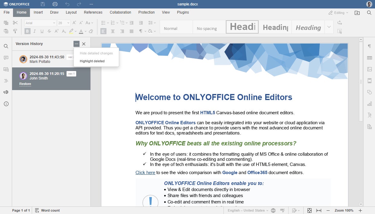 GDPRに準拠したオフィススイートは、テキスト文書、スプレッドシート、プレゼンテーション、フォーム、PDFのためのウェブベースのエディターで構成されており、OOXMLファイルとの完全な互換性を提供します。編集機能として、リアルタイムおよびパラグラフロックによる共同編集モード、コメントとレビュー、内蔵チャット、バージョン履歴を備えています。