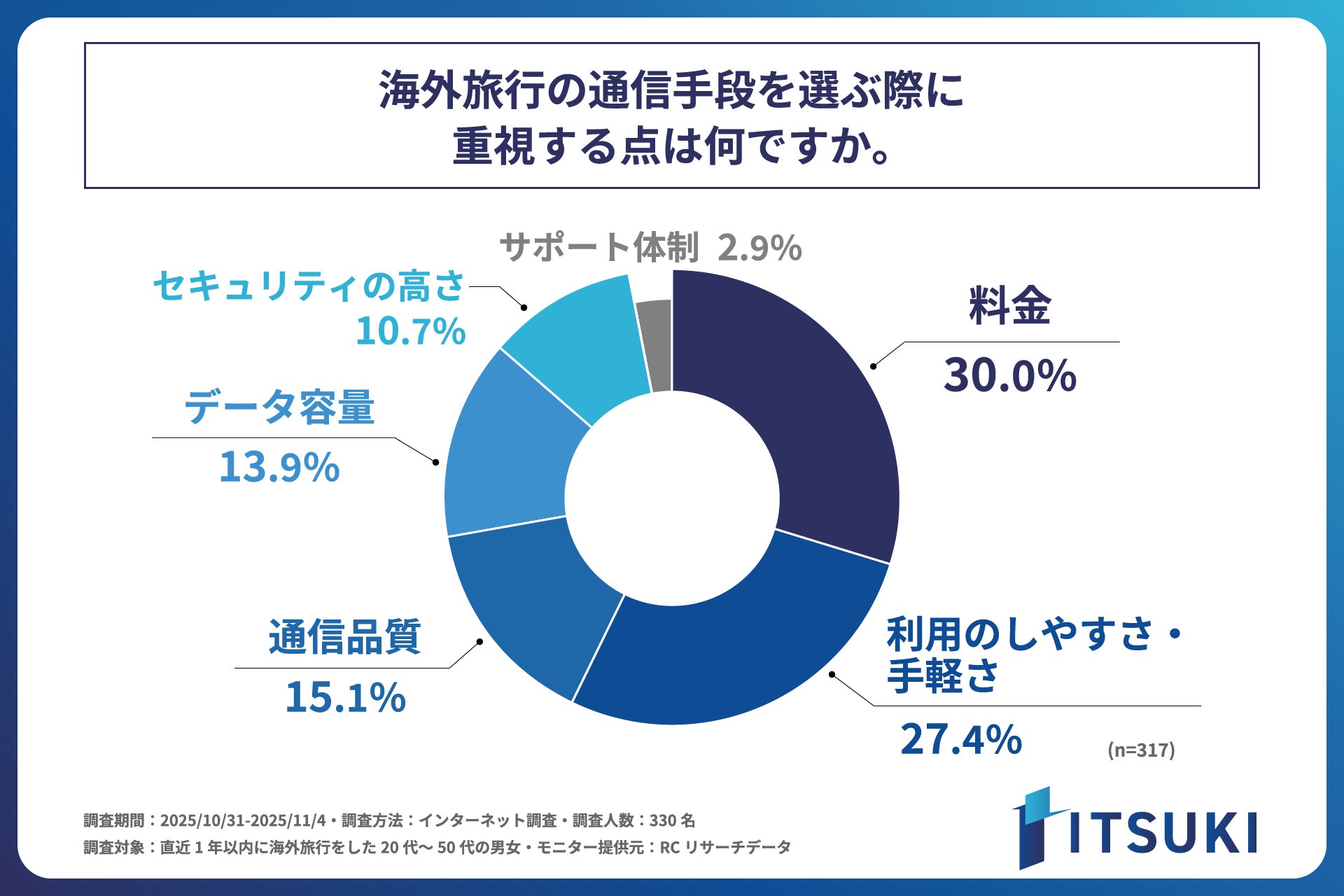 インターネット回線事業を行う株式会社ITSUKI(本社:東京都北区、代表取締役:岩下 一樹)は、直近1年以内に海外旅行をした20代~50代の男女を対象に「海外旅行時の"eSIM"利用実態に関する調査」を実施しました。この調査から、直近1年以内に海外旅行をした20代~50代の男女の海外旅行における通信手段の利用実態や、eSIMを利用した人が感じるeSIMのメリットなどが明らかになりました。