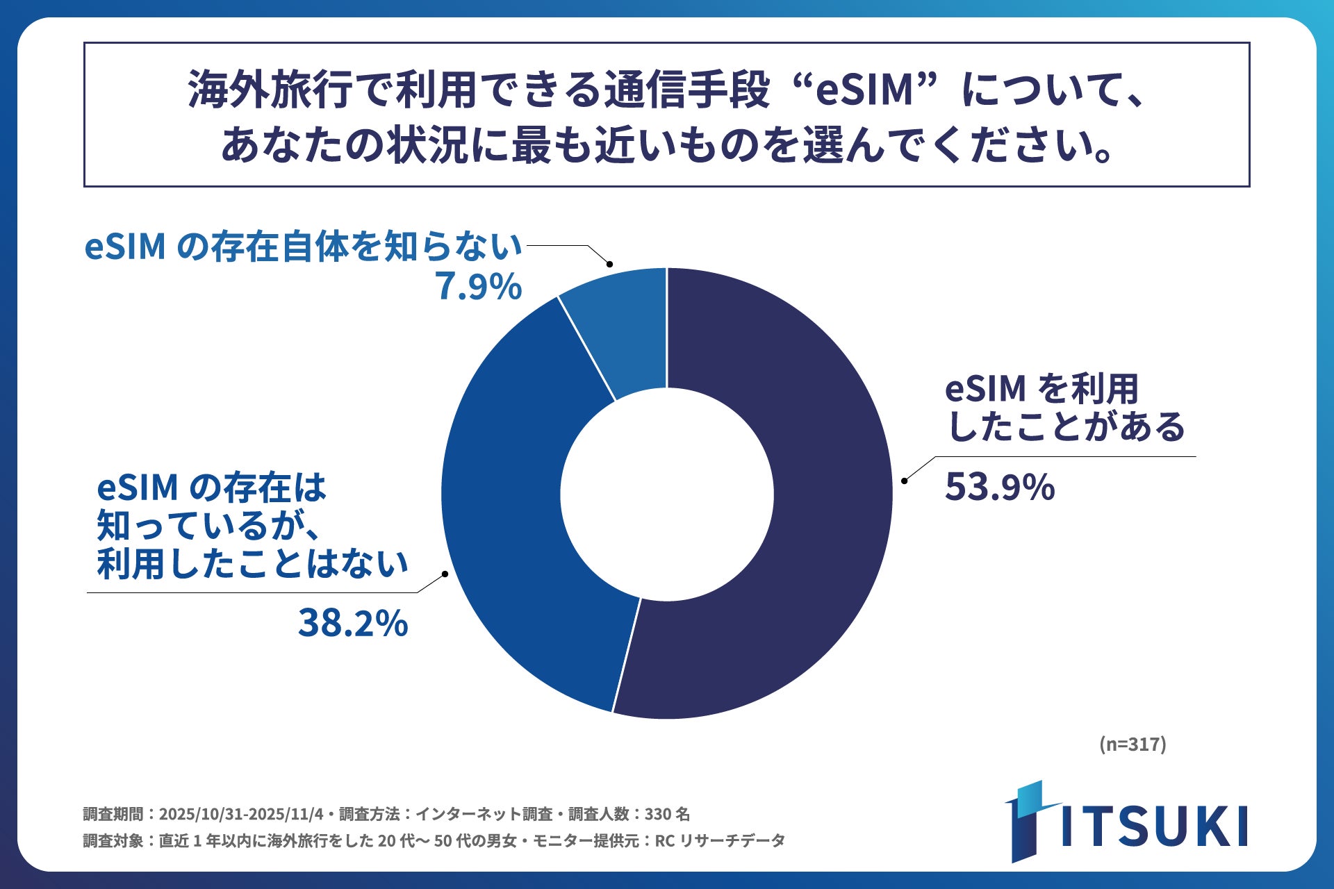 直近1年以内に海外旅行をした人の半数以上が、海外旅行でeSIMを利用したことがある!株式会社ITSUKIが「海外旅行時の"eSIM"利用実態に関する調査」を実施!