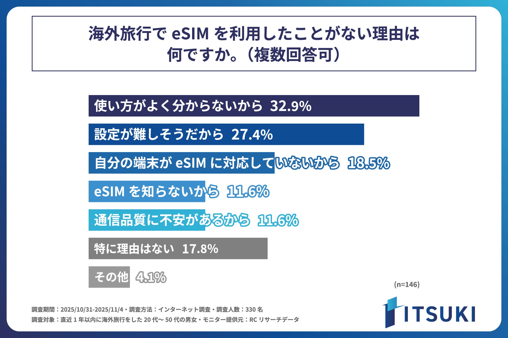 調査の最後、海外旅行で何らかの通信手段を利用したものの、eSIMを利用したことがないと回答した人を対象に「海外旅行でeSIMを利用したことがない理由」を尋ねる設問への回答では、1位が「使い方がよく分からないから」で32.9%、2位が「設定が難しそうだから」で27.4%、3位が「自分の端末がeSIMに対応していないから」で18.5%という結果になりました。この結果から、海外旅行でeSIMを利用したことがない主な理由は「使い方がよく分からないから」や「設定が難しそうだから」であることが明らかになりました。
