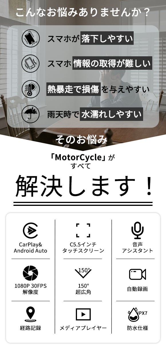 スマホのアプリをバイクでも使用可能!CarPlay/Android Auto対応5.5インチバイク用ディスプレイオーディオ「MotorCycle」