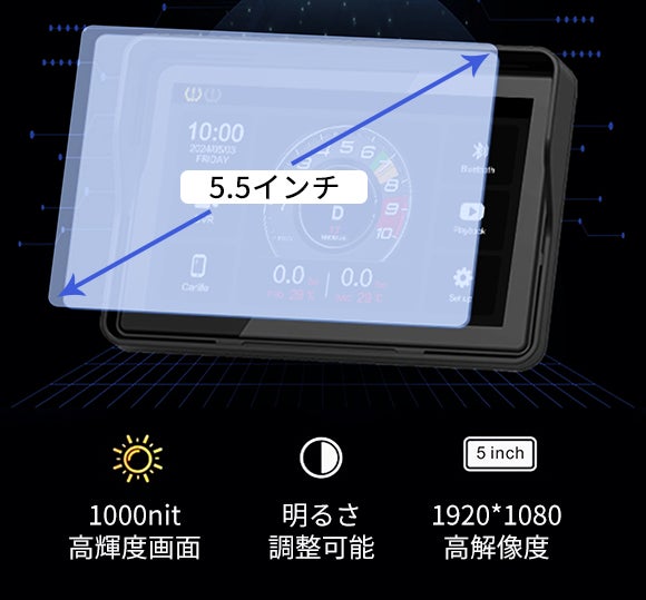 従来のTNとVAパネルは見る角度で色が変わるというデメリットあり、それを踏まえて、「MotorCycle」は5.5インチ全画面IPS液晶を採用しています。非常に広い視野角を備えており、ほとんどの角度から画像を鮮明に見ることができ、日差しの強い日中でも、白飛びすることなく表示することができます。