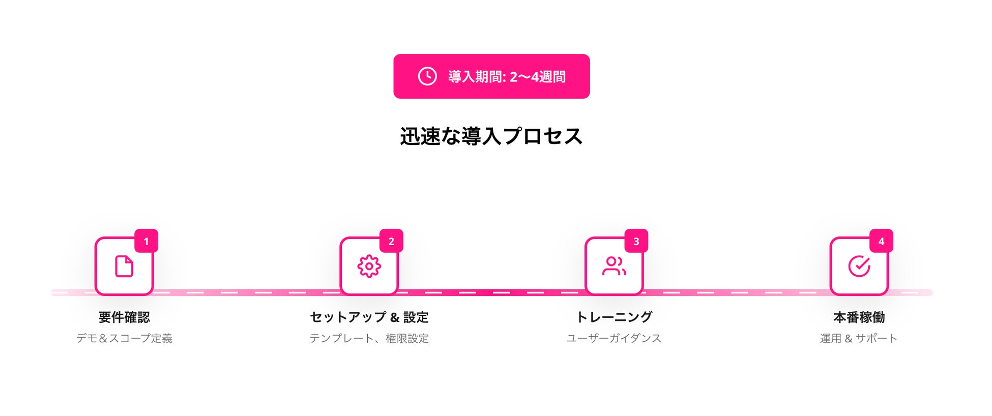 特に、「Meet AI+」は2〜4週間で導入可能です。日本企業の特性である「慎重なシステム統合」と「業務を止めない」という要望に対応しています。