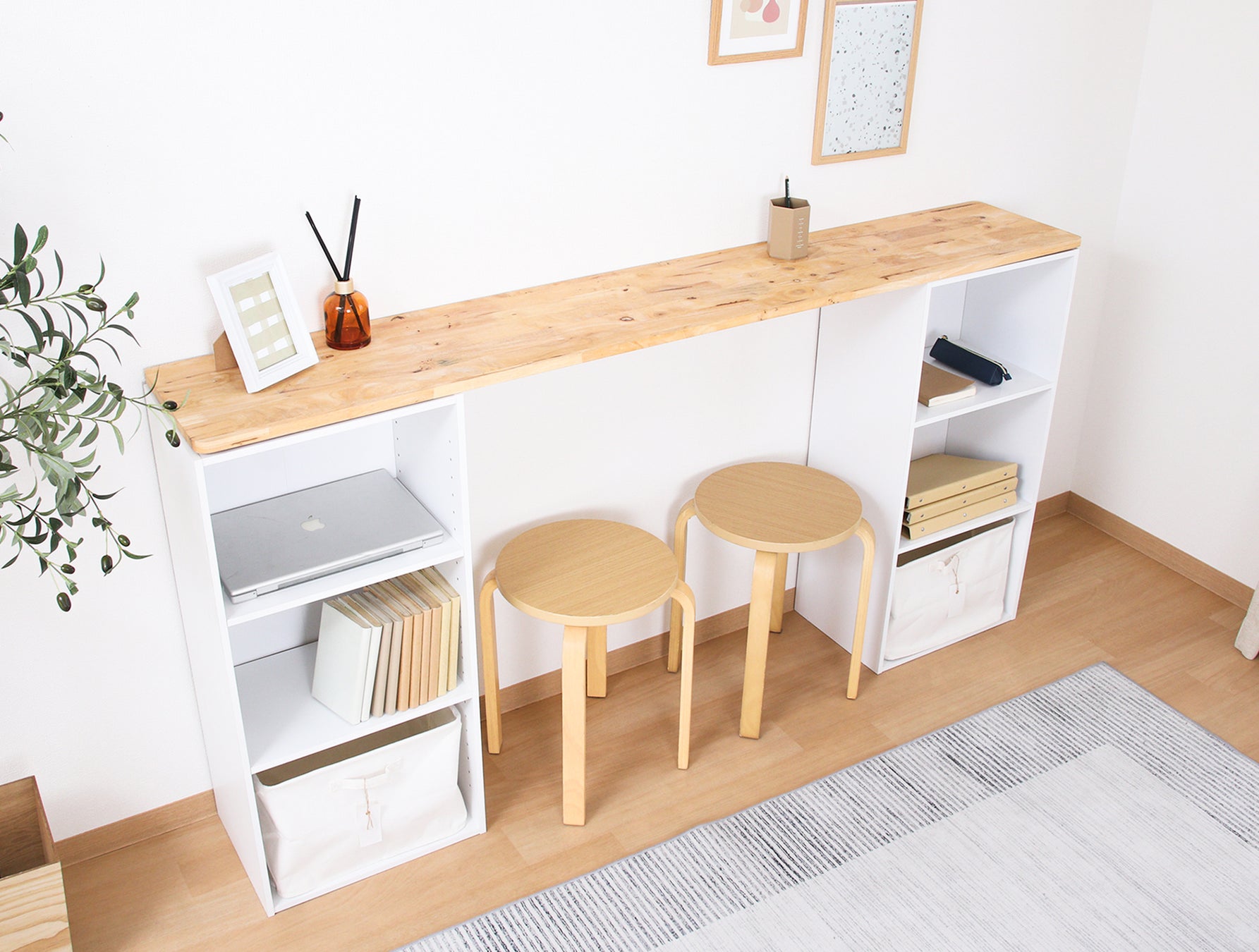2台のカラーボックスに板を橋渡しするだけで、たっぷり物が収納できるデスクが完成。また増設も簡単なので、スペースが足りない時や使う人数が増えても対応可能です。