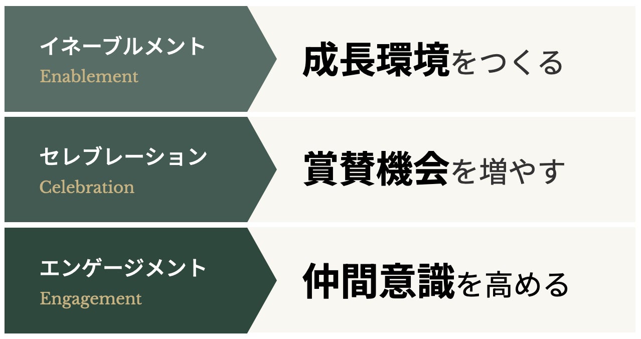 本アワードの審査は、企業・団体の事例を対象に、エンプロイーサクセスの実現に必要な「イネーブルメント」(成長環境を作る)、「セレブレーション」(賞賛機会を増やす)、「エンゲージメント」(仲間意識を高める)の3つを軸に、独自性、成果・効果、社会性・影響力、活用方法の再現性、などに基づき総合的に選考を行います。
