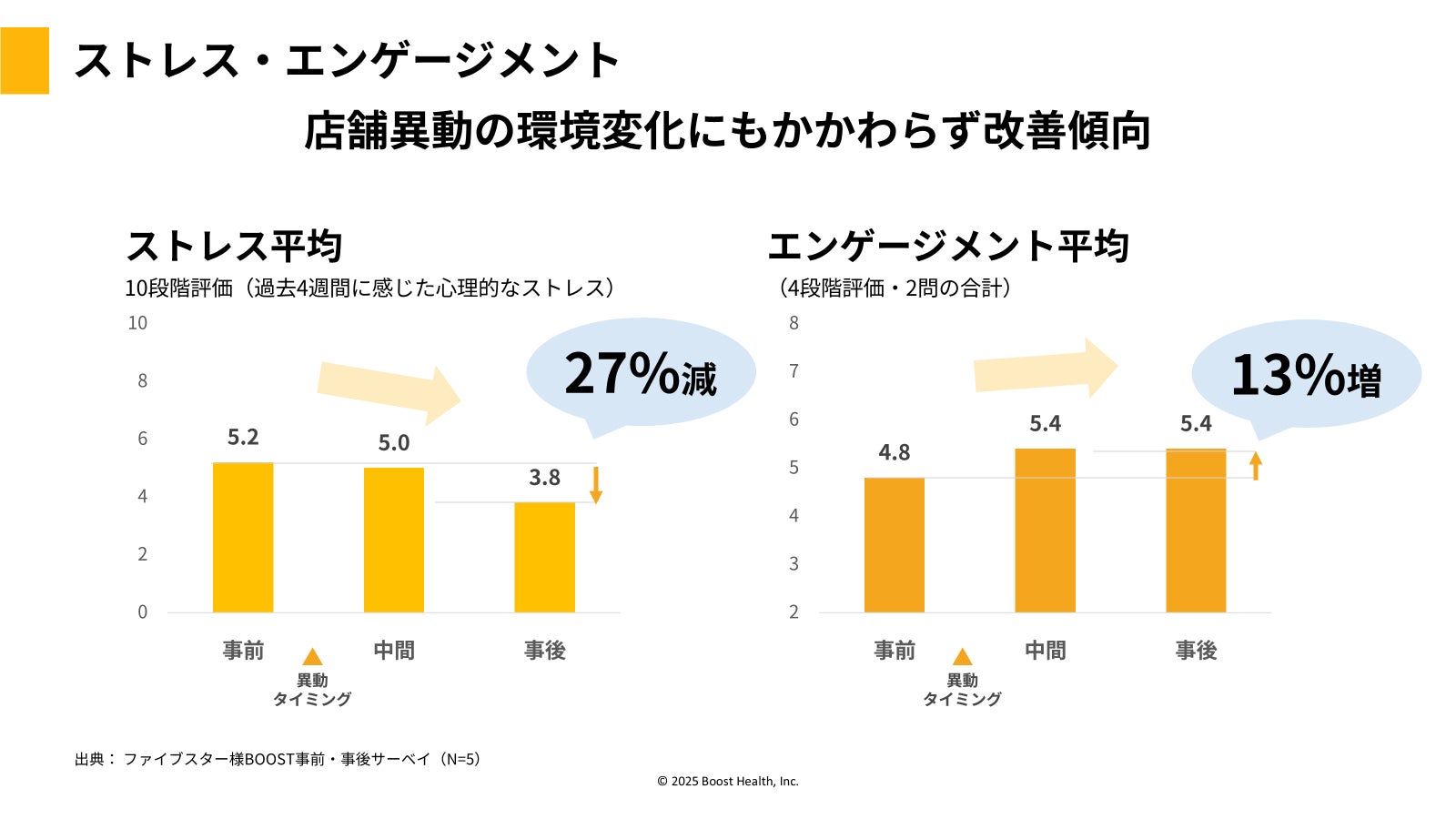 本取り組みでは、9週間のBOOSTプログラムを通じて、店長・主任5名のストレス27%改善、エンゲージメント13%構造、キャリア明確度58%向上など、短期間での顕著な改善が確認されました。